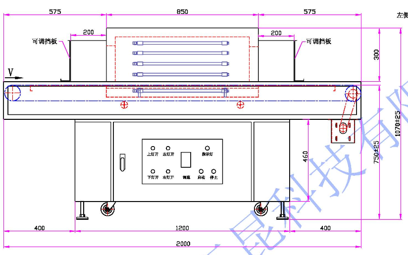 | 3、UV燈尺寸:600mm | 4、輸送材料:特氟龍網帶(導條防偏網帶) |